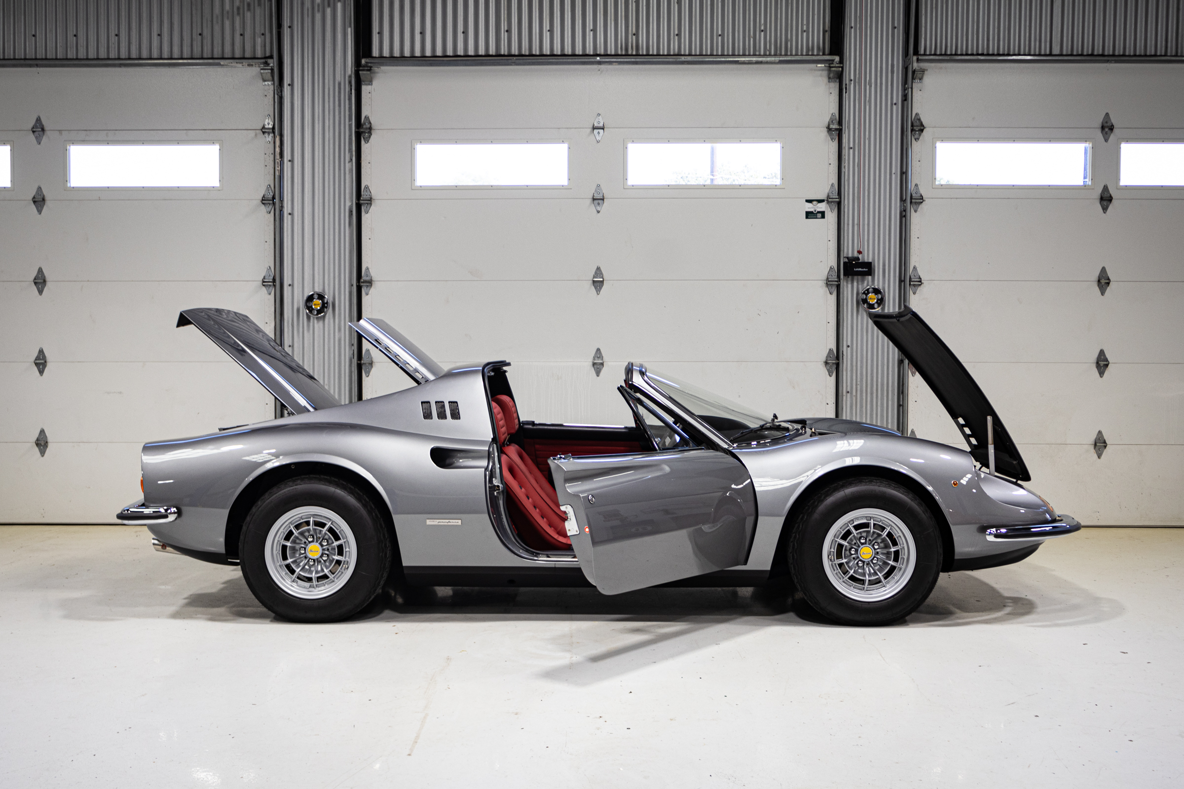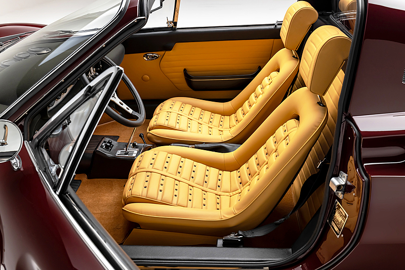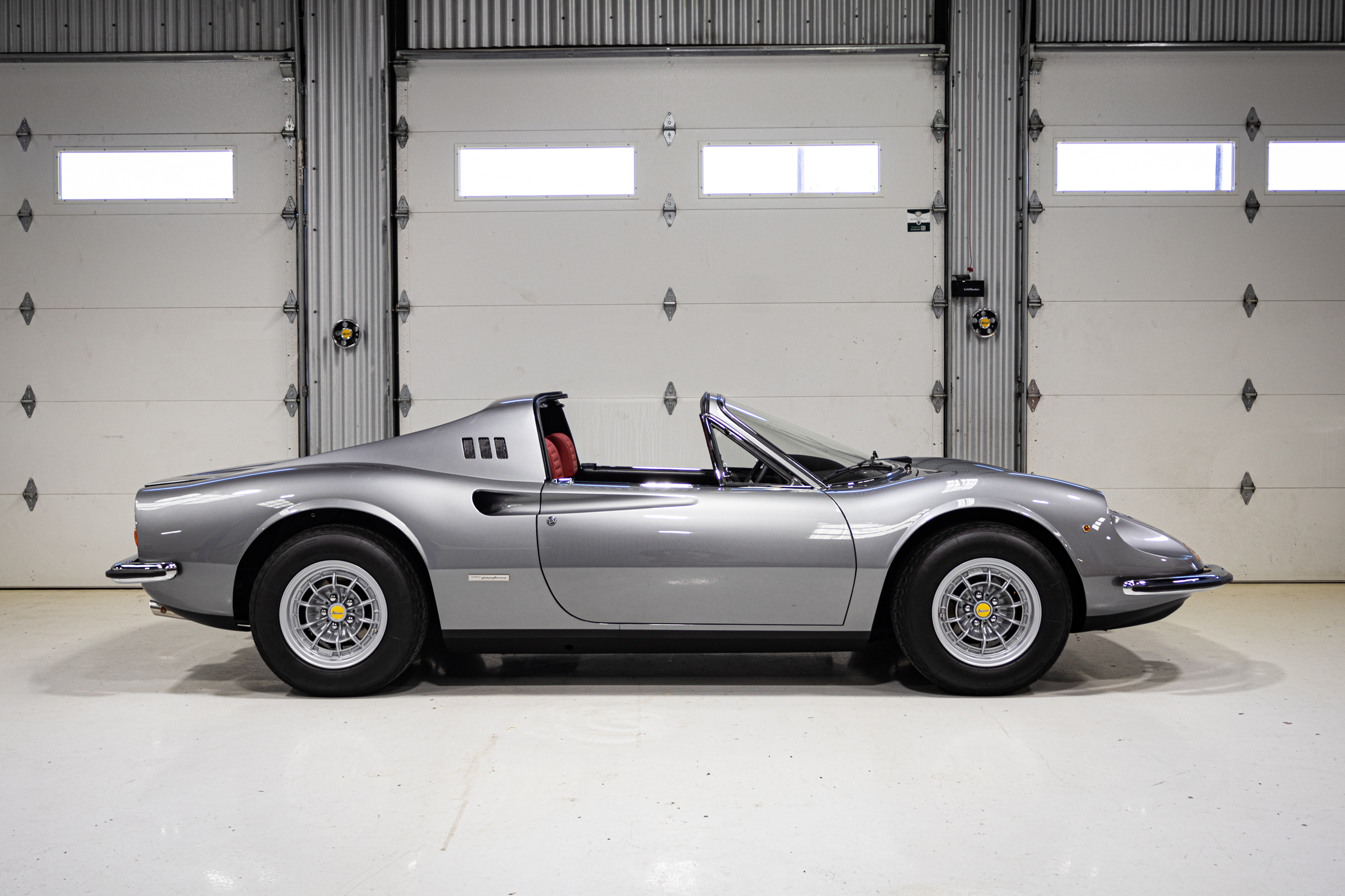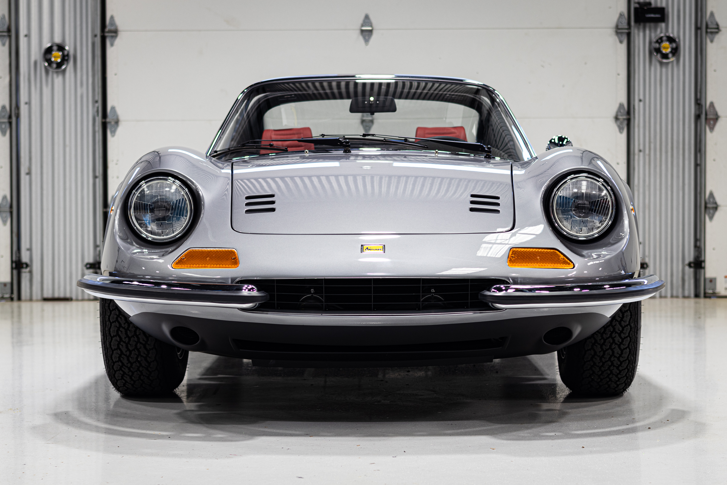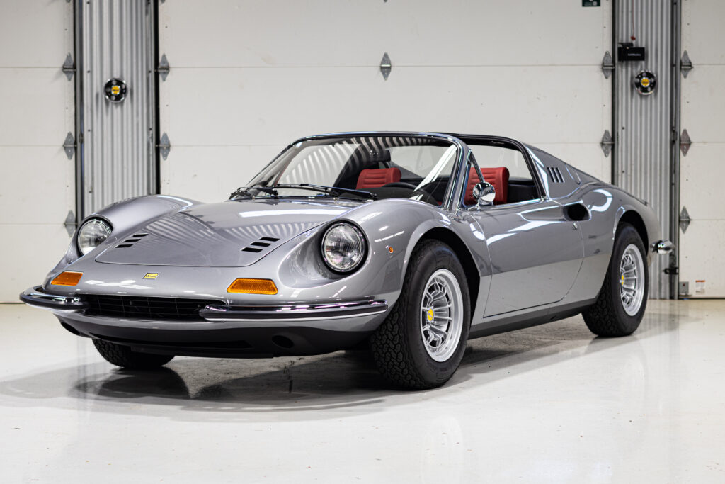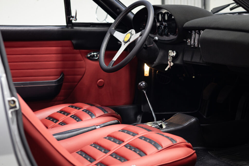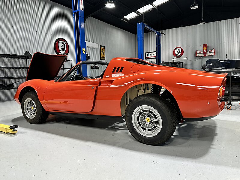 This one is another that got the euro treatment and was painted in Rosso Dino. We’ve done most of the reassembly, the wiring harness is all in place, the majority of the interior is done, and the engine is supposed to go back in the car in a week or two. It should be finished up soon. Don’t mind the tires, they were pulled off an old car!